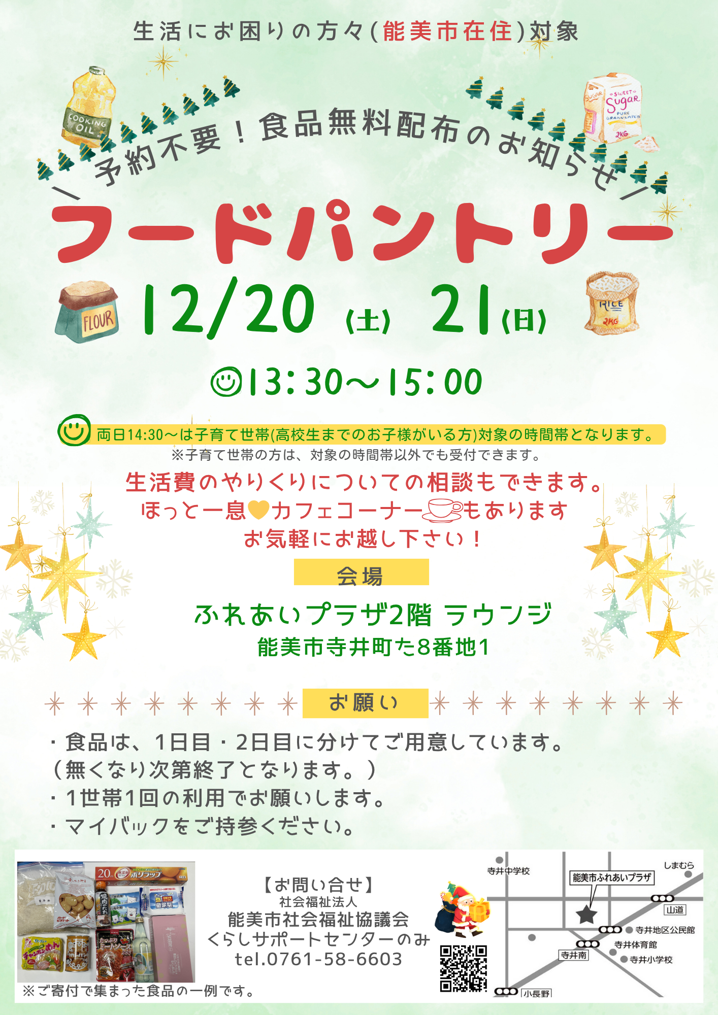 12月20日(土)21日(日)の2日間にわたって、市民の方々や団体・企業のご寄付で集まった食料品を無償でお配りします。事前予約は不要です。会場はふれあいプラザ2階です。ほっと一息❤カフェコーナーもあります。カフェコーナーのご利用のみも可能です。